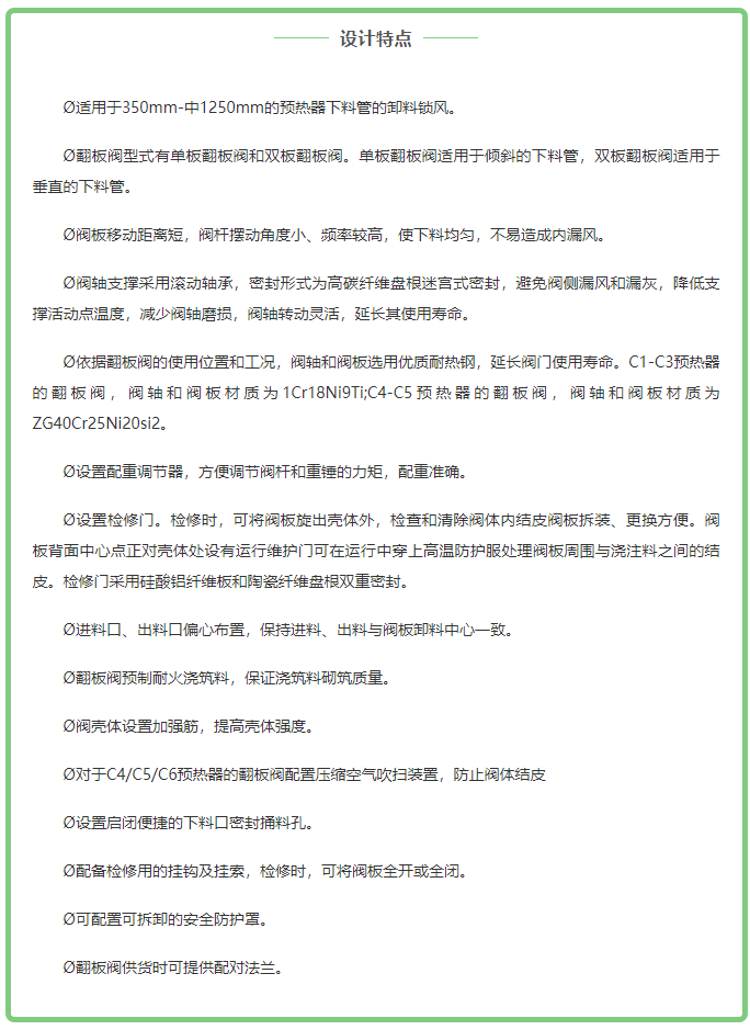 HENT預(yù)熱器高溫翻板閥根據(jù)訂單生產(chǎn),可同時(shí)提供預(yù)熱器高溫分料閥,特殊需求需加以說(shuō)明。訂做前請(qǐng)廠家提供預(yù)熱器的管道詳細(xì)尺寸(管子外徑,有效通經(jīng)和法蘭間距)及布置圖。