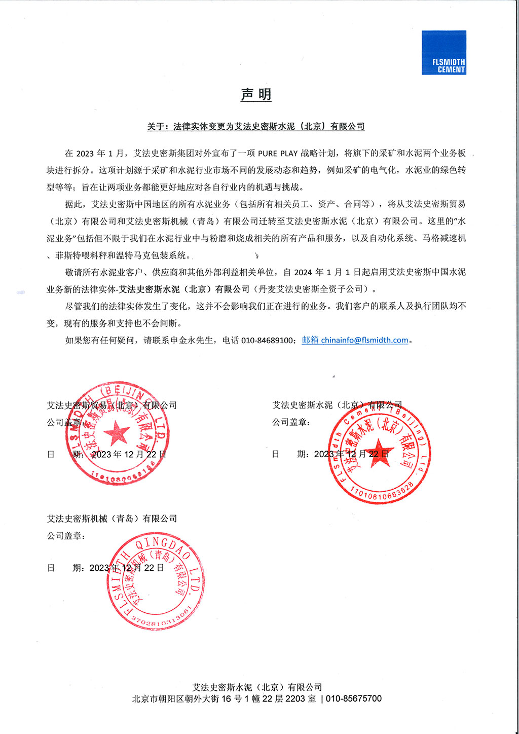 敬請(qǐng)所有水泥業(yè)客戶(hù)、供應(yīng)商和其他外部利益相關(guān)單位,自2024年1月1日起啟用艾法史密斯中國(guó)水泥業(yè)務(wù)新的法律實(shí)體-艾法史密斯水泥(北京有限公司(丹麥艾法史密斯全資子公司)。
