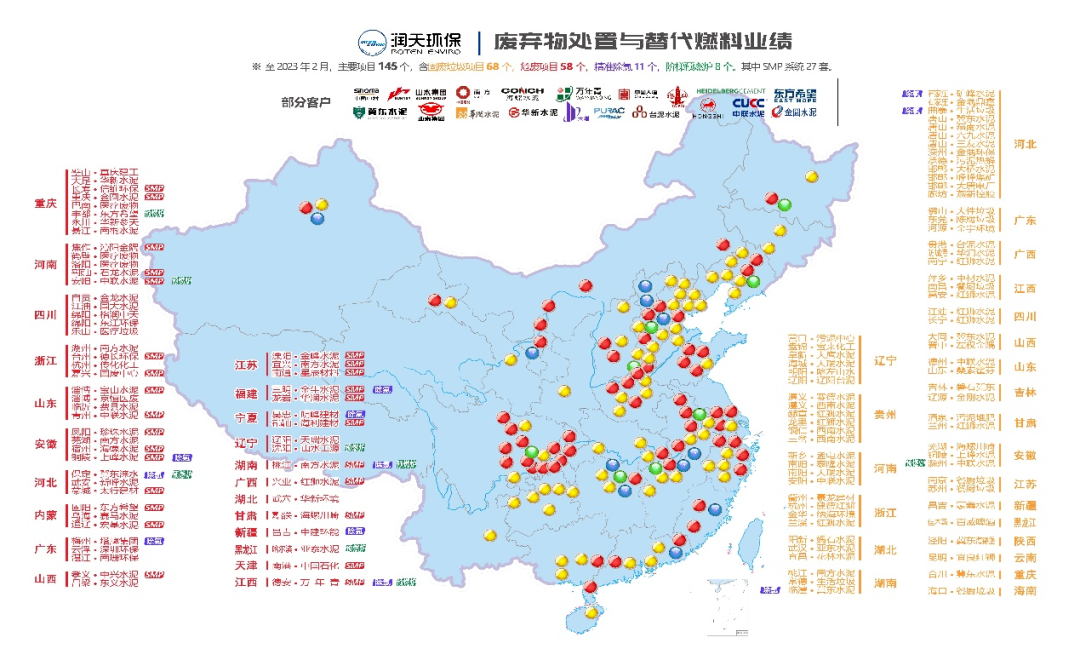 截至目前潤(rùn)天環(huán)保已成功為中國(guó)建材、海螺水泥、金隅冀東、紅獅水泥、臺(tái)灣水泥、亞洲水泥、金圓水泥、華新水泥、山水水泥、萬(wàn)年青水泥等各大水泥集團(tuán)落地了廢棄物協(xié)同處置、水泥窯燃料替代等項(xiàng)目。