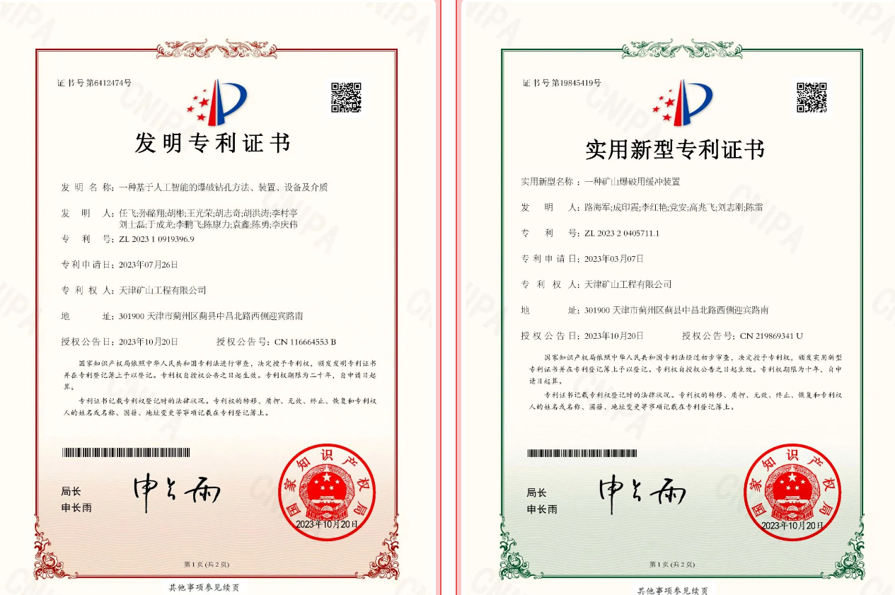 2023年發(fā)明專利授權(quán)2項(xiàng)、進(jìn)入實(shí)質(zhì)審查4項(xiàng),實(shí)用新型專利授權(quán)1項(xiàng)、進(jìn)入實(shí)質(zhì)審查9項(xiàng)?!稒C(jī)械開采研究》探究繩鋸機(jī)和破碎錘聯(lián)合開采工藝的破巖機(jī)理,在玉山南方等多個(gè)項(xiàng)目得到廣泛應(yīng)用。東鄉(xiāng)、廣德分公司《綠色礦山抑塵及可控石塊大小開采破碎技術(shù)的研發(fā)》,有效降低礦山爆破大塊率。發(fā)表論文《基于灰?guī)r動(dòng)態(tài)力學(xué)特性的自由面機(jī)械破巖方法》,形成軟件著作《礦山鉆孔定位系統(tǒng)》。“降低大塊率、提高爆破效果技術(shù)研究”課題獲得中材礦山科技創(chuàng)新項(xiàng)目2等獎(jiǎng)。