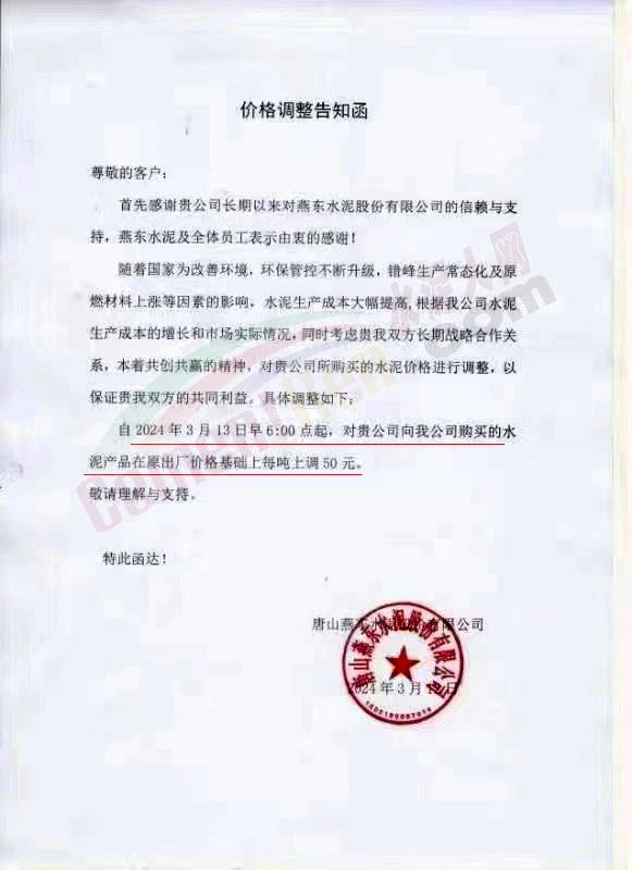 唐山燕東水泥通知,自2024年3月13日早6:00點起,水泥產(chǎn)品在原出廠價格基礎(chǔ)上每噸上調(diào)50元