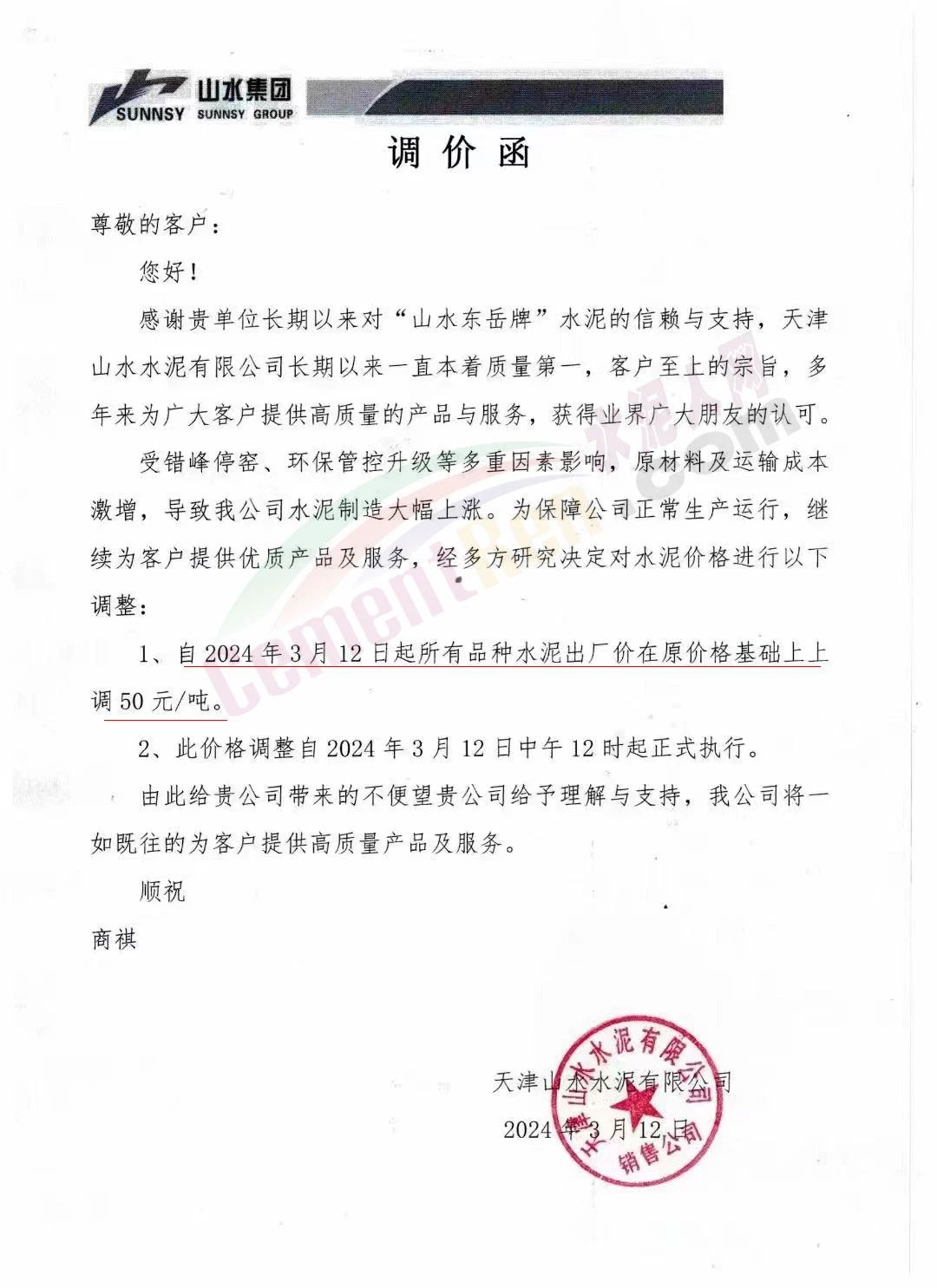 天津山水水泥通知,受錯峰停窯、環(huán)保管控升級等多重因素影響,原材料及運(yùn)輸成本激增,導(dǎo)致公司水泥制造大幅上漲。為保障公司正常生產(chǎn)運(yùn)行,繼續(xù)為客戶提供優(yōu)質(zhì)產(chǎn)品及服務(wù),經(jīng)多方研究決定自2024年3月12日起所有品種水泥出廠價在原價格基礎(chǔ)上上調(diào)50元/噸。
