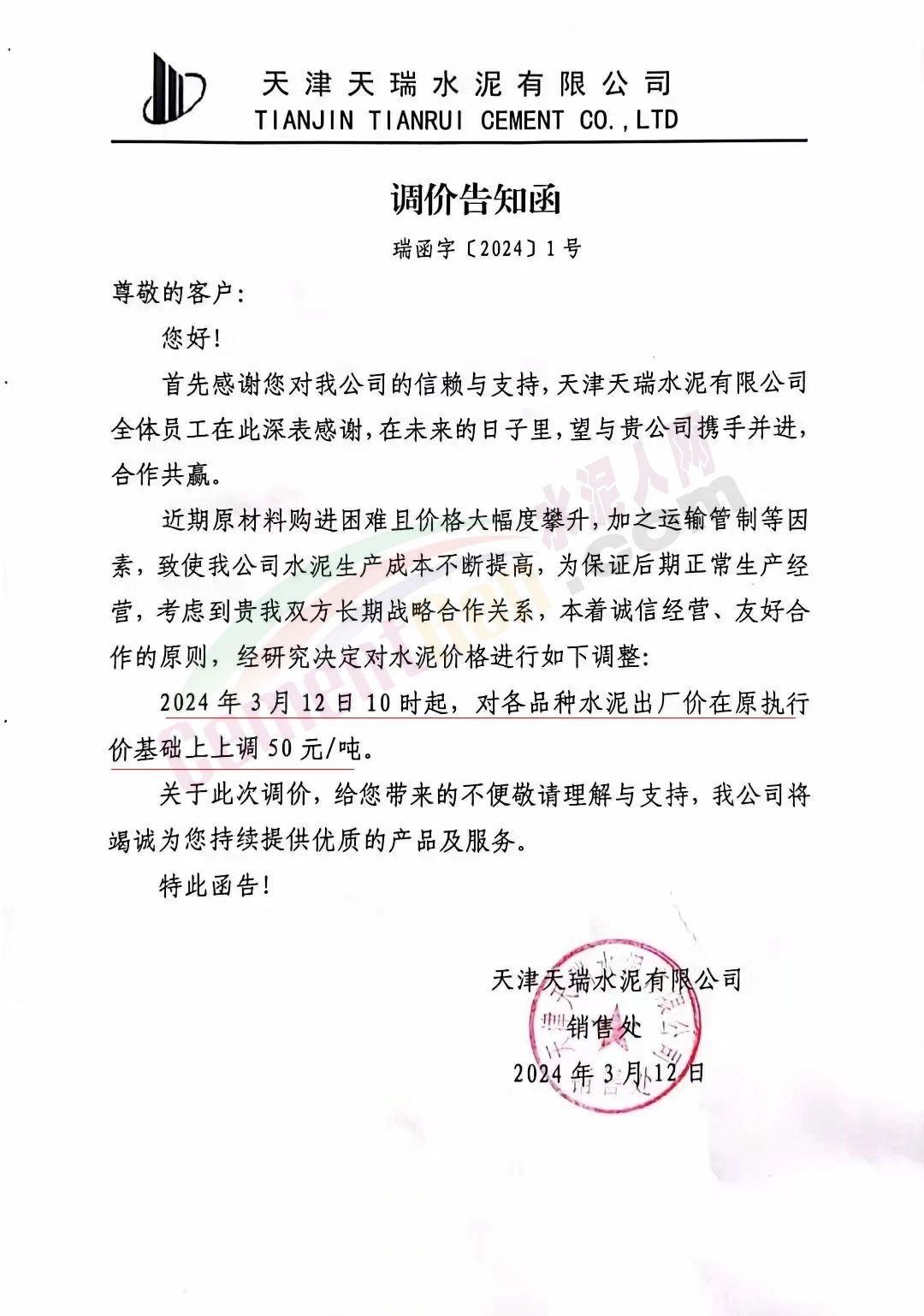 天津天瑞水泥有限公司通知,近期原材料購進(jìn)困難且價格大幅度攀升,加之運(yùn)輸管制等因素,致使公司水泥生產(chǎn)成本不斷提高,經(jīng)研究決定2024年3月12日10時起,對各品種水泥出廠價在原執(zhí)行價基礎(chǔ)上上調(diào)50元/噸。