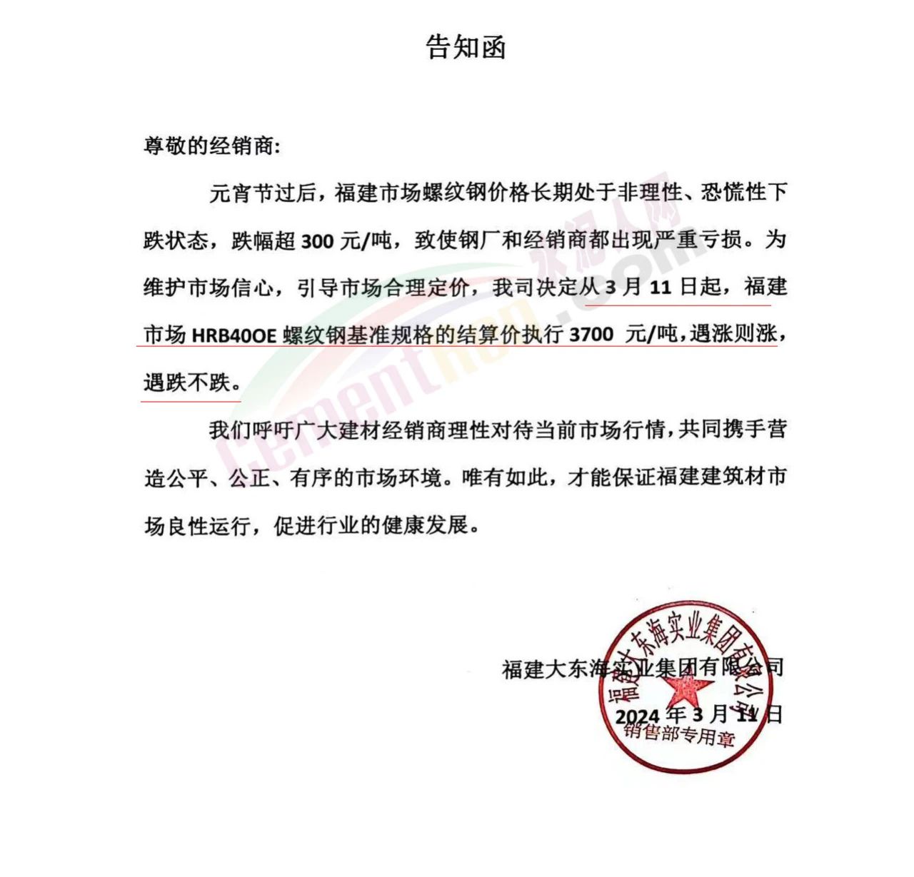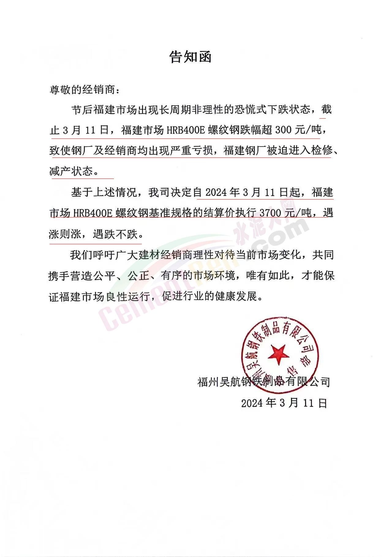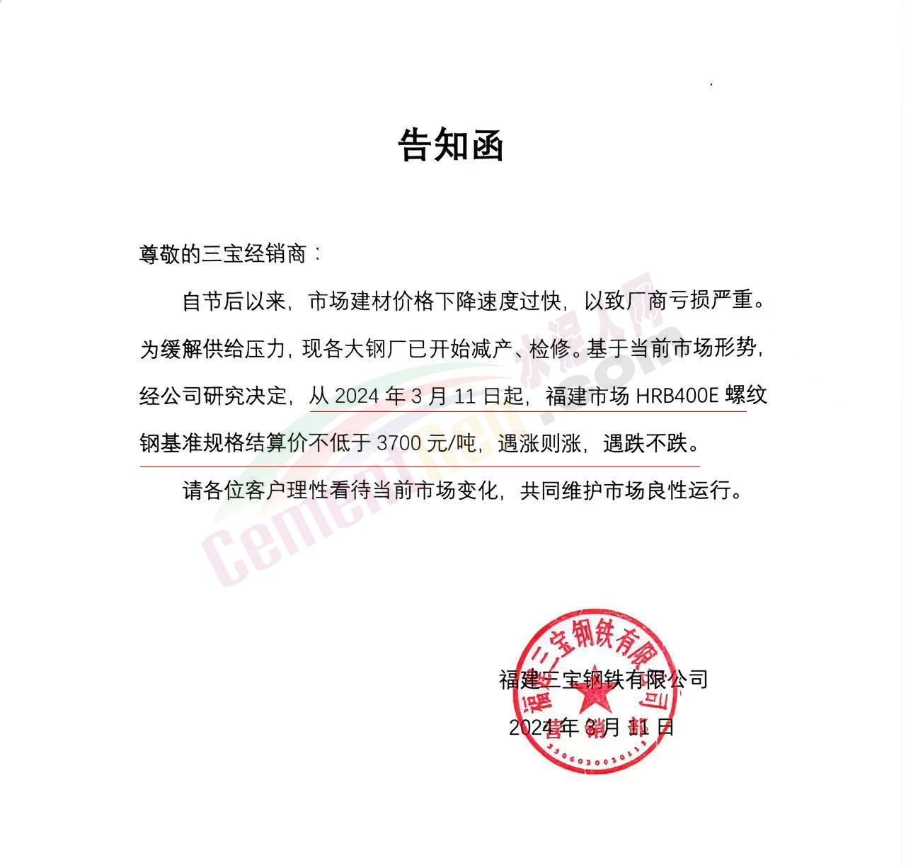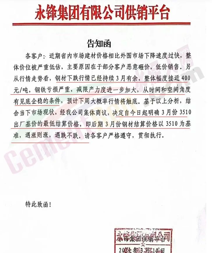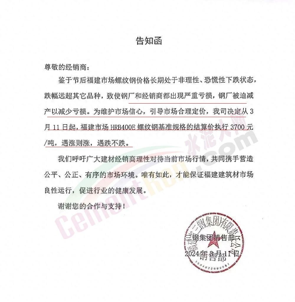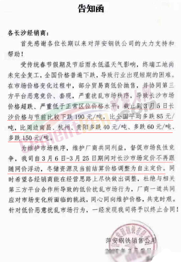 福建區(qū)域鋼鐵企業(yè)通知,鑒于節(jié)后福建市場螺紋鋼價格長期處于非理性、恐慌性下跌狀態(tài),跌幅遠超其它品種,致使鋼廠和經銷商都出現嚴重虧損,鋼廠被迫減產以減少虧損。為維護市場信心,引導市場合理定價。福建鋼廠集體限價,遇漲則漲,遇跌不跌。