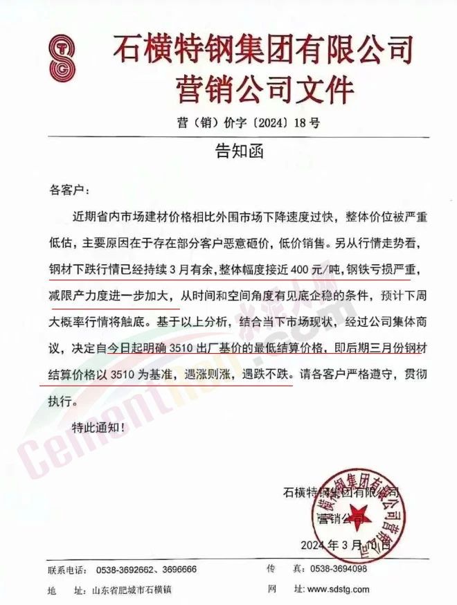 山東鋼廠通知,從行情走勢看,鋼材下跌行情已經持續(xù)3月有余,整體幅度接近400元/噸,鋼鐵虧損嚴重,減限產力度進一步加大。從時間和空間角度有見底企穩(wěn)的條件,預計下周大概率行情將觸底。經公司商議決定即日起明確3519出廠價基價的最低結算價格,即后期三月份鋼材結算價格以3519為基準,遇漲則漲,遇跌不跌。