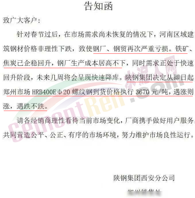 水泥人網通訊員消息:春節(jié)長假剛剛結束,建筑鋼材的價格就開始狂跌。有些鋼廠看不下去了,開始發(fā)限價通知價格跟漲不跟跌。