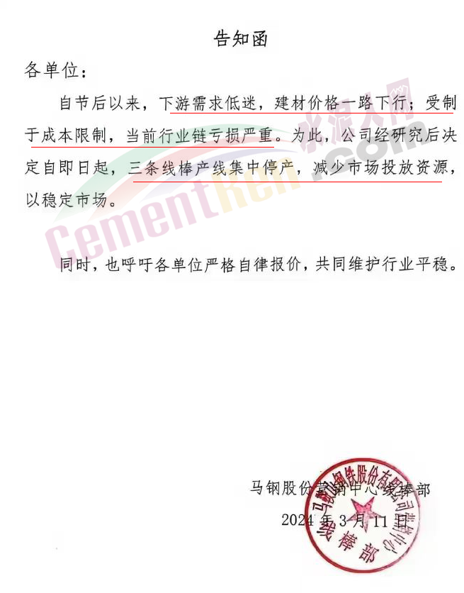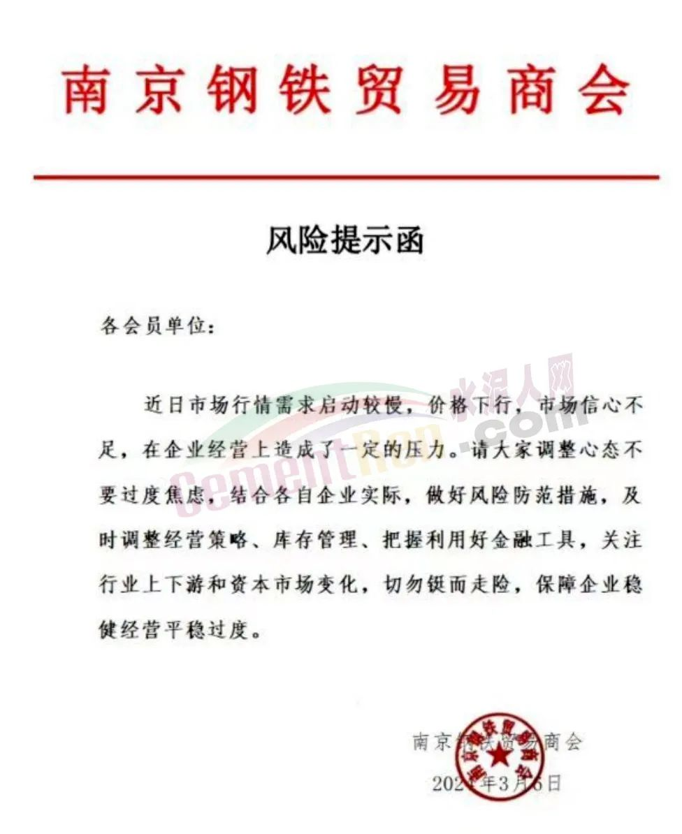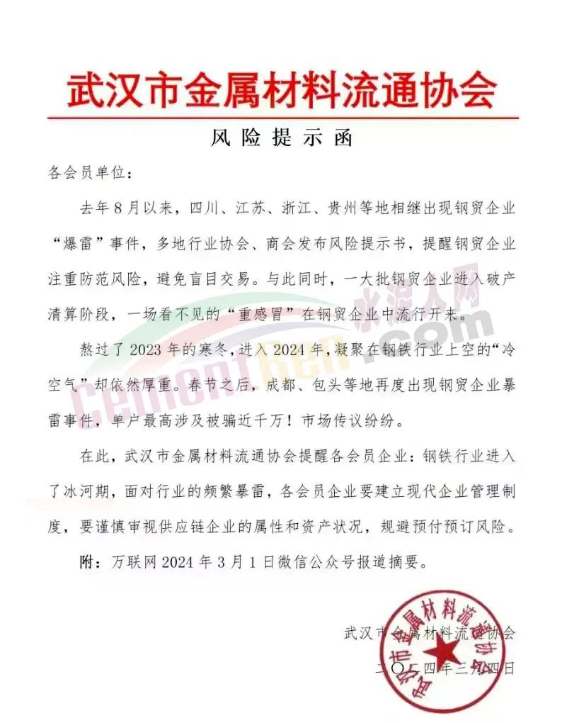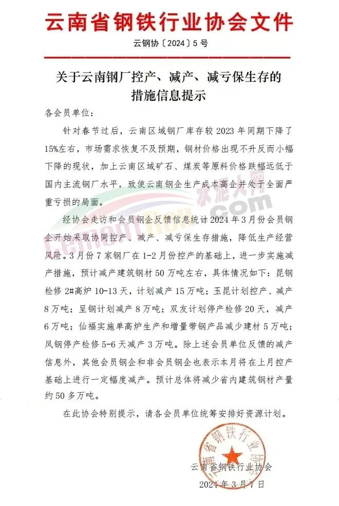 武漢市金屬材料流通協(xié)會發(fā)布《風險提示函》提到,鋼鐵行業(yè)進入了冰河期;云南省鋼鐵協(xié)會發(fā)布《關于云南鋼廠控產、減產、減虧保生存的措施信息提示》稱,2024年3月份鋼企開始采取協(xié)同控產、減產、減虧保生存措施,降低生產經營風險。3月份7家鋼廠在1-2月份控產的基礎上,進一步實施減產措施,預計減產建筑鋼材50萬噸左右;南京鋼鐵貿易商會發(fā)《風險提示函》,提示會員企業(yè)要及時調整經營策略。
