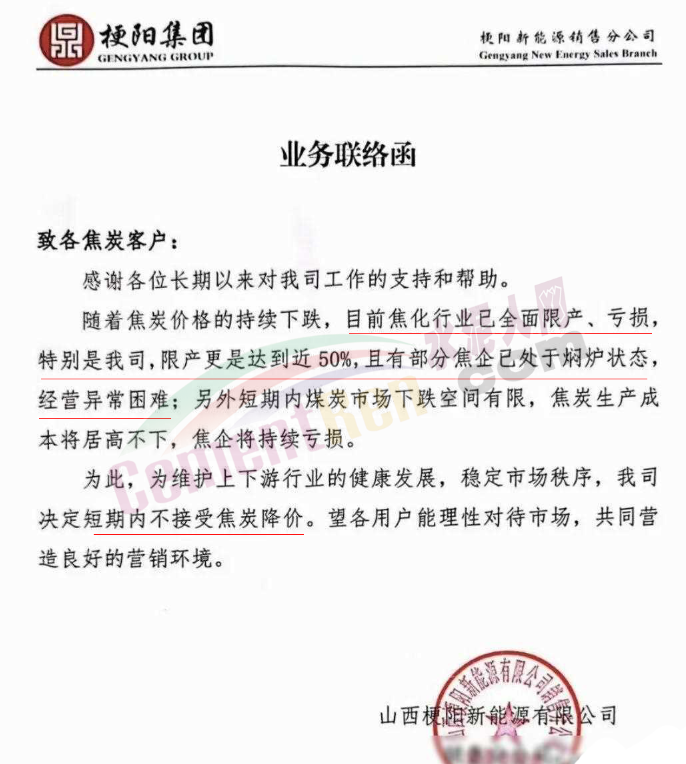 同時,焦企也跟著干,發(fā)函宣布不再降價;地方的行業(yè)協(xié)會也出來發(fā)文提醒大家,繼而原料企業(yè)也開始發(fā)文了。相關行業(yè)人士表示,下游需求銳減,不僅導致產能過剩、行業(yè)競爭激烈,價格狂跌,如此下去,將有很多企業(yè)面臨資金鏈斷裂的風險。
