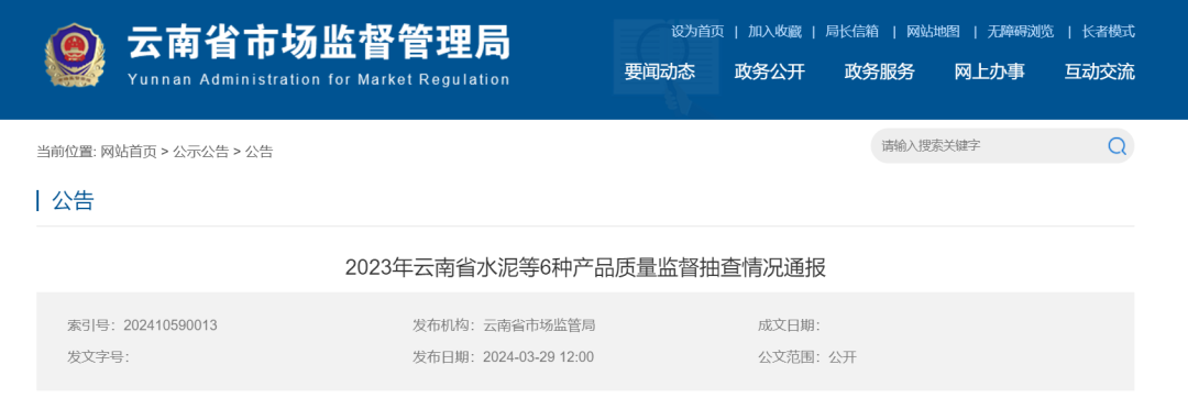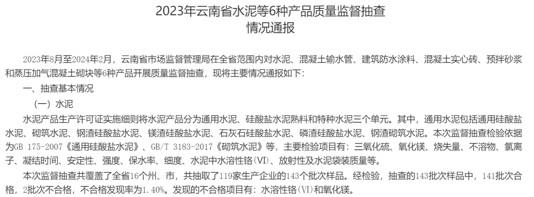 日前,云南省市場監(jiān)管局發(fā)布《2023年云南省水泥等6種產(chǎn)品質(zhì)量監(jiān)督抽查情況通報(bào)》稱,2023年8月至2024年2月,云南省市場監(jiān)督管理局在全省范圍內(nèi)對水泥、混凝土輸水管、建筑防水涂料、混凝土實(shí)心磚、預(yù)拌砂漿和蒸壓加氣混凝土砌塊等6種產(chǎn)品開展質(zhì)量監(jiān)督抽查。