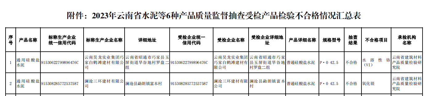 本次監(jiān)督抽查共覆蓋了全省16個(gè)州、市,共抽取了119家生產(chǎn)企業(yè)的143個(gè)批次樣品。經(jīng)檢驗(yàn),抽查的143批次樣品中,141批次合格,2批次不合格,不合格發(fā)現(xiàn)率為1.40%。其中,云南昊龍實(shí)業(yè)集團(tuán)巧家白鶴灘建材有限公司P.O42.5水泥水溶性鉻(VI)項(xiàng)目不合格;瀾滄三環(huán)建材有限公司P.O42.5水泥氧化鎂項(xiàng)目不合格。