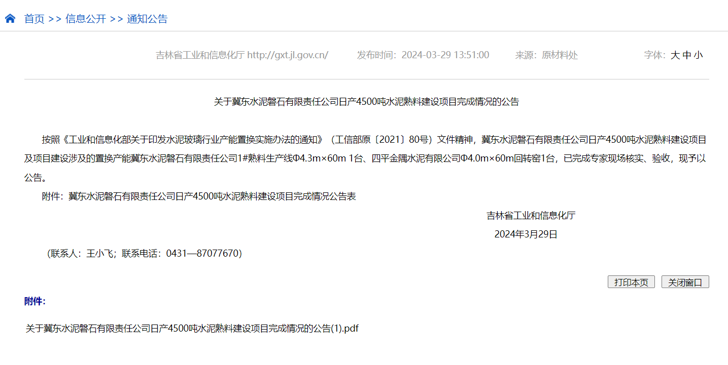 吉林省工信廳同日發(fā)布《關(guān)于冀東水泥磐石有限責(zé)任公司日產(chǎn)4500噸水泥熟料建設(shè)項目完成情況的公告》稱,按照《工業(yè)和信息化部關(guān)于印發(fā)水泥玻璃行業(yè)產(chǎn)能置換實施辦法的通知》(工信部原〔2021〕80號)文件精神,冀東水泥磐石有限責(zé)任公司日產(chǎn)4500噸水泥熟料建設(shè)項目及項目建設(shè)涉及的置換產(chǎn)能冀東水泥磐石有限責(zé)任公司1#熟料生產(chǎn)線Φ4.3m×60m 1臺、四平金隅水泥有限公司Φ4.0m×60m回轉(zhuǎn)窯1臺,已完成專家現(xiàn)場核實、驗收,現(xiàn)予以公告。
