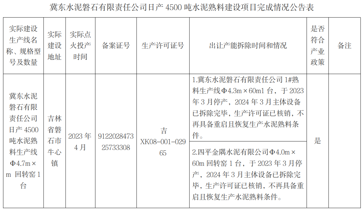 出讓產(chǎn)能拆除時間和情況顯示,冀東水泥磐石有限責(zé)任公司1#熟料生產(chǎn)線Φ4.3m×60m1臺,于2023年3月停產(chǎn),2024年3月主體設(shè)備已拆除完畢,生產(chǎn)許可證已核銷,不再具備重啟且恢復(fù)生產(chǎn)水泥熟料條件;四平金隅水泥有限公司Φ4.0m×60m回轉(zhuǎn)窯1臺,于2023年3月停產(chǎn),2024年3月主體設(shè)備已拆除完畢,生產(chǎn)許可證已核銷,不再具備重啟且恢復(fù)生產(chǎn)水泥熟料條件。