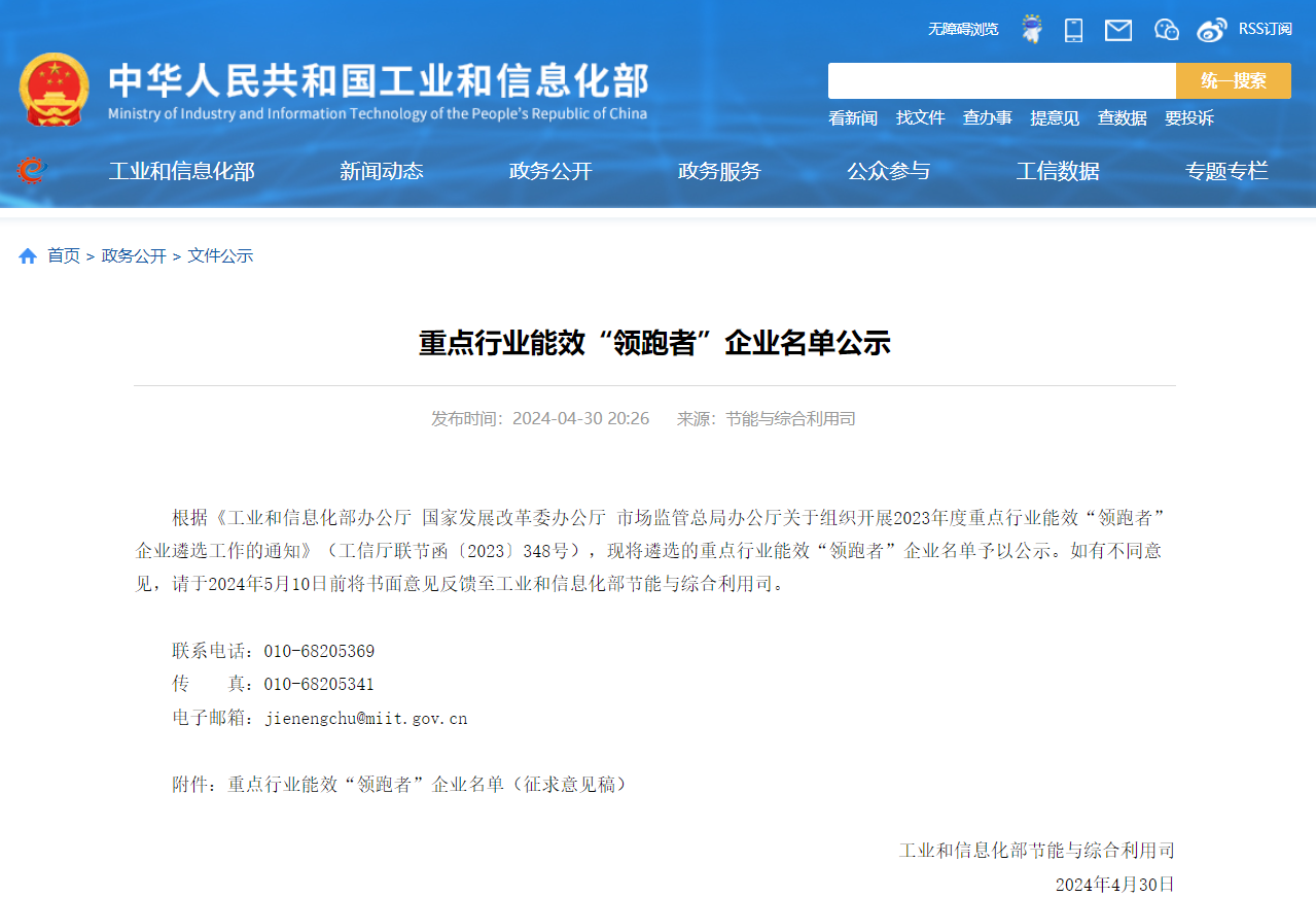 日前,工信部發(fā)布《重點(diǎn)行業(yè)能效“領(lǐng)跑者”企業(yè)名單公示》稱(chēng),根據(jù)《工業(yè)和信息化部辦公廳 國(guó)家發(fā)展改革委辦公廳 市場(chǎng)監(jiān)管總局辦公廳關(guān)于組織開(kāi)展2023年度重點(diǎn)行業(yè)能效“領(lǐng)跑者”企業(yè)遴選工作的通知》(工信廳聯(lián)節(jié)函〔2023〕348號(hào)),現(xiàn)將遴選的重點(diǎn)行業(yè)能效“領(lǐng)跑者”企業(yè)名單予以公示。如有不同意見(jiàn),請(qǐng)于2024年5月10日前將書(shū)面意見(jiàn)反饋至工業(yè)和信息化部節(jié)能與綜合利用司。