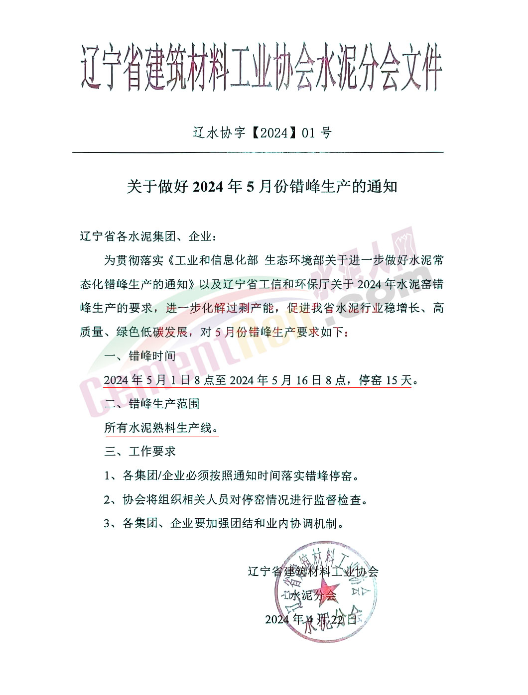 水泥人網(wǎng)通訊員消息:遼寧省內(nèi)所有水泥熟料生產(chǎn)線于2024年5月1日8點(diǎn)~2024年5月16日8點(diǎn),錯(cuò)峰停窯15天。