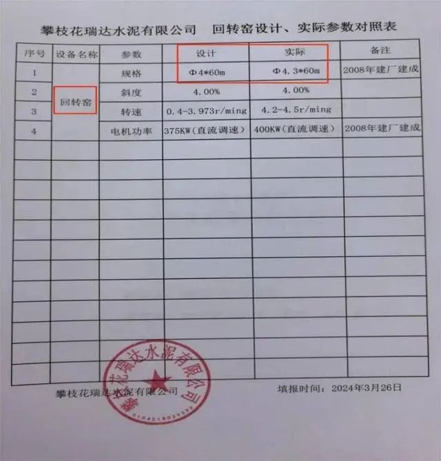 督察組發(fā)現(xiàn),當(dāng)?shù)厮嗥髽I(yè)落實(shí)相關(guān)要求存在差距。按照核準(zhǔn)產(chǎn)能,瑞達(dá)水泥應(yīng)配套建設(shè)直徑4米、裝機(jī)功率375千瓦的回轉(zhuǎn)窯,但實(shí)際建設(shè)直徑4.3米、裝機(jī)功率400千瓦的回轉(zhuǎn)窯,每日產(chǎn)能增長至3200噸、增幅28%。攀枝花市經(jīng)信部門于2020年1月公示瑞達(dá)水泥“水泥回轉(zhuǎn)窯直徑4.3米,水泥熟料實(shí)際日產(chǎn)能3200噸”,米易縣白馬工業(yè)園區(qū)管委會(huì)公示的瑞達(dá)水泥年產(chǎn)能達(dá)120萬噸,遠(yuǎn)遠(yuǎn)大于核準(zhǔn)產(chǎn)能。