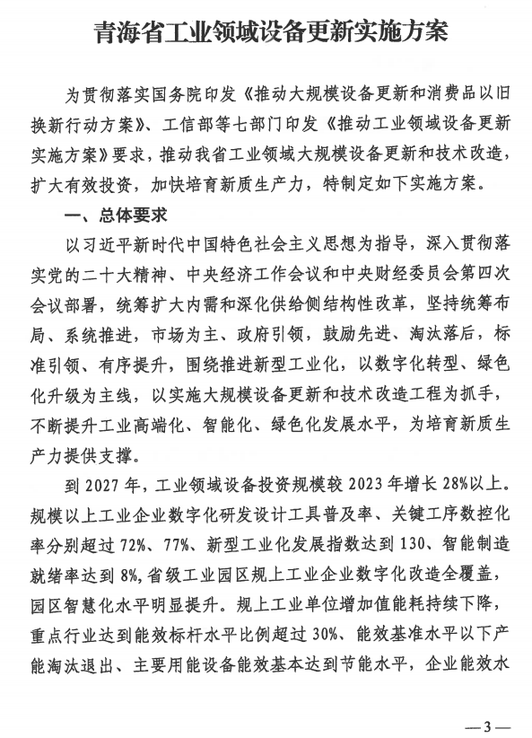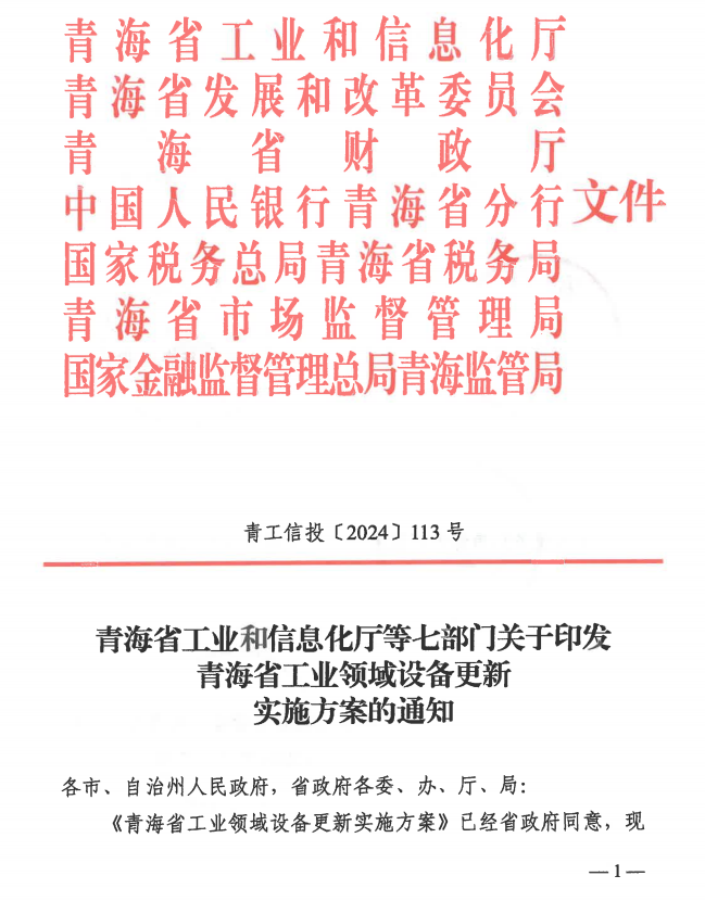 日前,青海省工業(yè)和信息化廳等七部門關(guān)于印發(fā)青海省工業(yè)領(lǐng)域設備更新實施方案的通知。