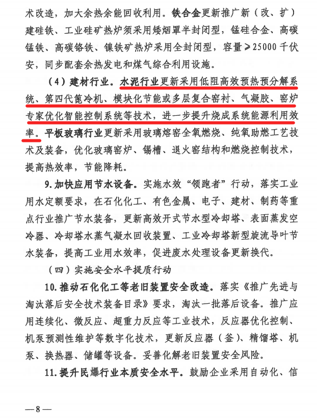 實施綠色化轉(zhuǎn)型提標行動。水泥行業(yè)更新采用低阻高效預熱預分解系統(tǒng)、第四代篦冷機、模塊化節(jié)能或多層復合窯襯、氣凝膠、窯爐專家優(yōu)化智能控制系統(tǒng)等技術(shù),進一步提升燒成系統(tǒng)能源利用效率。