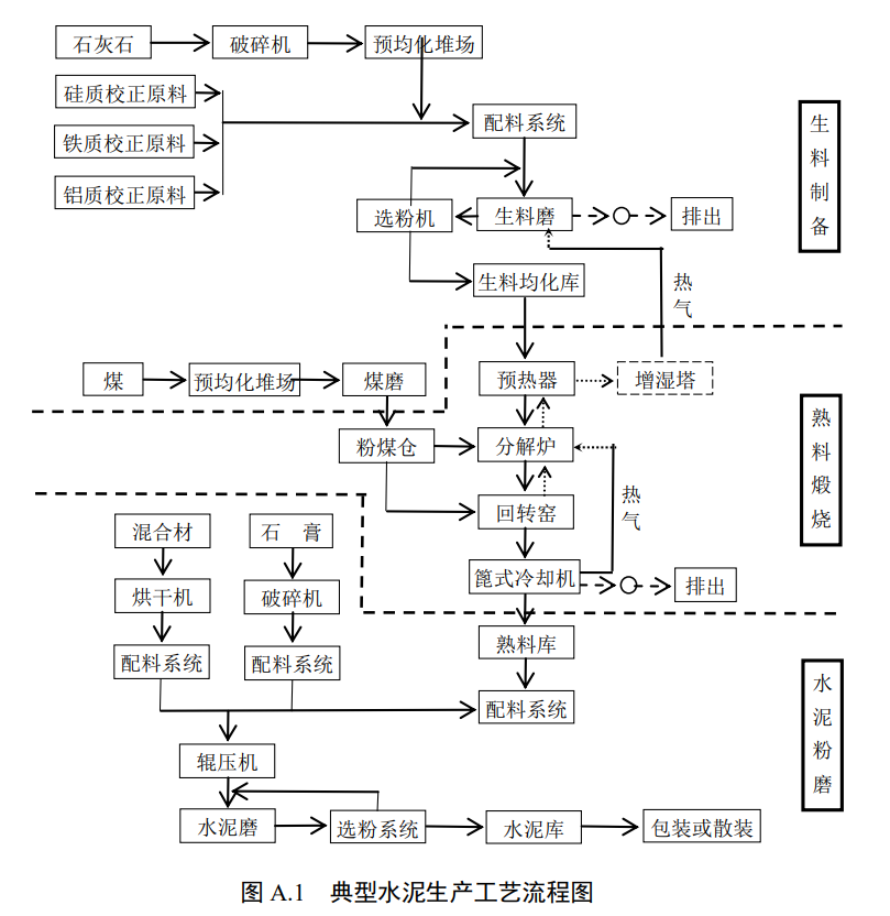 A.1.1 主要生產(chǎn)工藝:破碎、配料、回轉(zhuǎn)窯煅燒、烘干、水泥粉磨、水泥制品加工等。