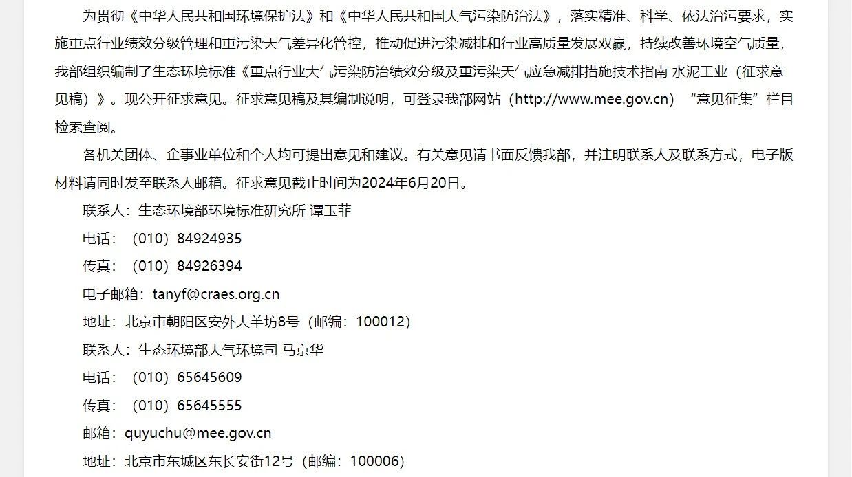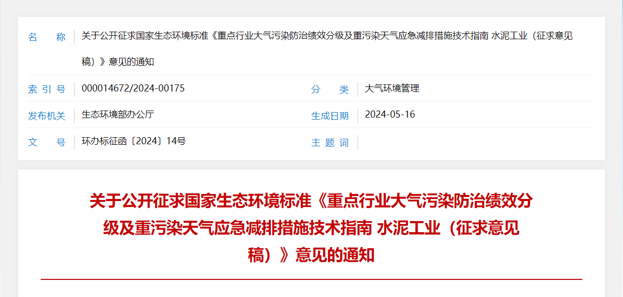 5月16日,生態(tài)環(huán)境部辦公廳發(fā)布關(guān)于公開征求國家生態(tài)環(huán)境標(biāo)準(zhǔn)《重點(diǎn)行業(yè)大氣污染防治績效分級及重污染天氣應(yīng)急減排措施技術(shù)指南水泥工業(yè)(征求意見稿)》意見的通知(以下簡稱“征求意見稿”)。