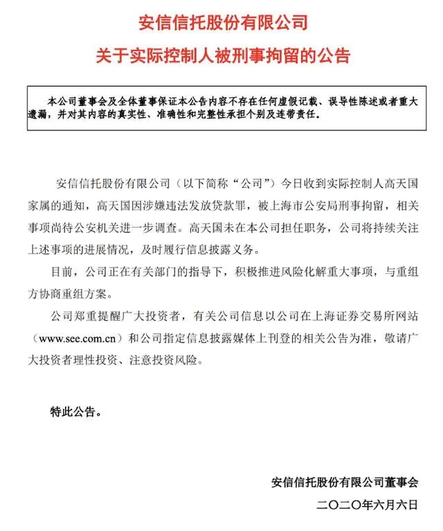 2019年,安信信托多個項目“爆雷”無法兌付,并被法院列入被執(zhí)行人,訴訟纏身。2020年6月,安信信托公告稱,收到實際控制人高天國家屬的通知,高天國因涉嫌違法發(fā)放貸款罪,被上海市公安局刑事拘留,這也成為三至喜來登酒店走向拍賣的開端。