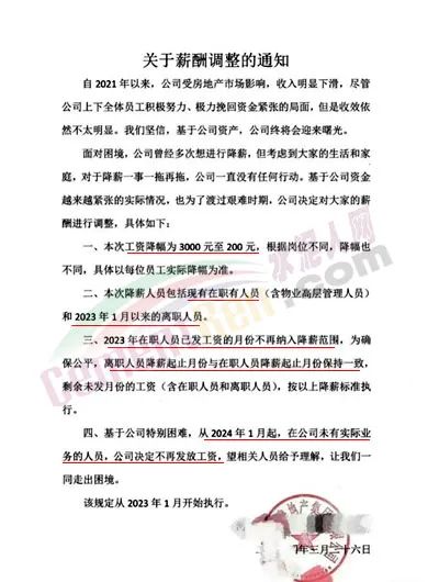 該房企通知稱,基于公司資金越來(lái)越緊張的實(shí)際情況,也為了度過(guò)艱難時(shí)期,公司決定對(duì)大家的薪酬進(jìn)行調(diào)整。本次工資降幅為200元~3000元,降薪人員包括現(xiàn)有在職人員和2023年1月以來(lái)的離職人員。離職人員降薪起止月份與在職人員降薪起止月份保持一致,剩余未發(fā)月份的工資按降薪標(biāo)準(zhǔn)執(zhí)行。從2024年1月起,在公司未有實(shí)際業(yè)務(wù)的人員,公司決定不再發(fā)放工資。