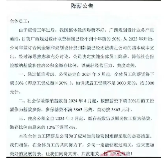 廣西某設(shè)計(jì)院發(fā)布降薪公告給全體員工稱,目前廣西規(guī)劃設(shè)計(jì)取費(fèi)標(biāo)準(zhǔn)已經(jīng)不到十年前的50%,從2023年開(kāi)始,公司年簽訂合同金額和規(guī)劃設(shè)計(jì)費(fèi)到款額已經(jīng)無(wú)法滿足公司的基本成本支出。經(jīng)過(guò)深思熟慮和充分討論,公司決定實(shí)施全體員工降薪、降低社會(huì)保險(xiǎn)繳納基數(shù)和住房公積金繳存比例,以減輕經(jīng)營(yíng)壓力,共渡難關(guān)。