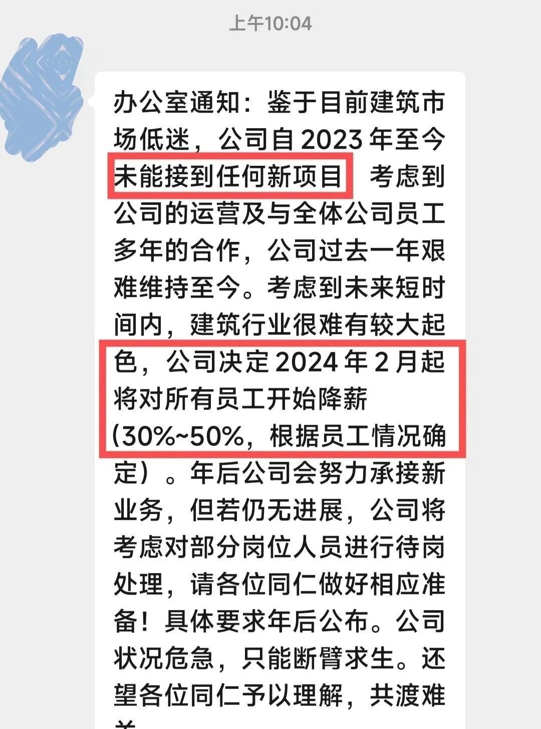 某施工企業(yè)通知稱,鑒于目前建筑市場(chǎng)低迷,公司自2023年至今未能接到任何新項(xiàng)目。考慮到未來(lái)短時(shí)間內(nèi),建筑行業(yè)很難有較大起色,公司決定2024年2月起將對(duì)所有員工開(kāi)始降薪30%~50%。