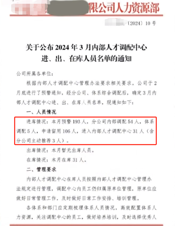某建筑央企局發(fā)布《關(guān)于公布2024年3月內(nèi)部人才調(diào)配中心進(jìn)、出、在庫(kù)人員名單的通知》提到當(dāng)月預(yù)警193人,在庫(kù)31人。