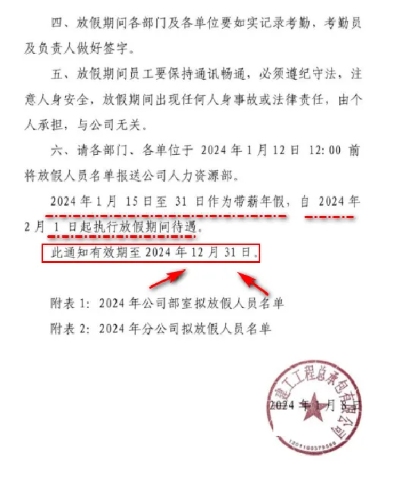 某建工工程總承包公司通知稱,2024年1月15日公司開(kāi)始陸續(xù)放假,一直到2024年12月31日。從2月1日到12月31日開(kāi)始放假,待崗人員每月發(fā)放2600元基本工資,社保個(gè)人部分自己負(fù)擔(dān)。
