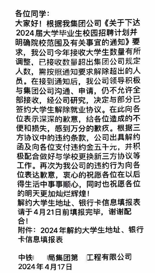 某中鐵工程企業(yè)發(fā)通知稱,今年接受大學(xué)生數(shù)據(jù)有所調(diào)整,已接收數(shù)據(jù)超出集團(tuán)公司規(guī)定人數(shù),將與部分已簽約學(xué)生解除就業(yè)協(xié)議。