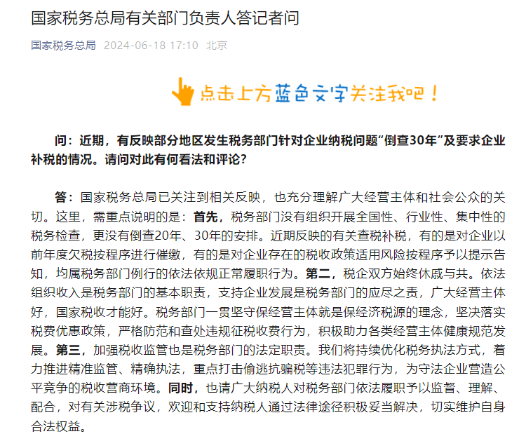 6月18日,國家稅務總局官方微信發(fā)布答記者問消息。”辟謠“部分地區(qū)發(fā)生稅務部門針對企業(yè)納稅問題“倒查30年”及要求企業(yè)補稅的相關問題。