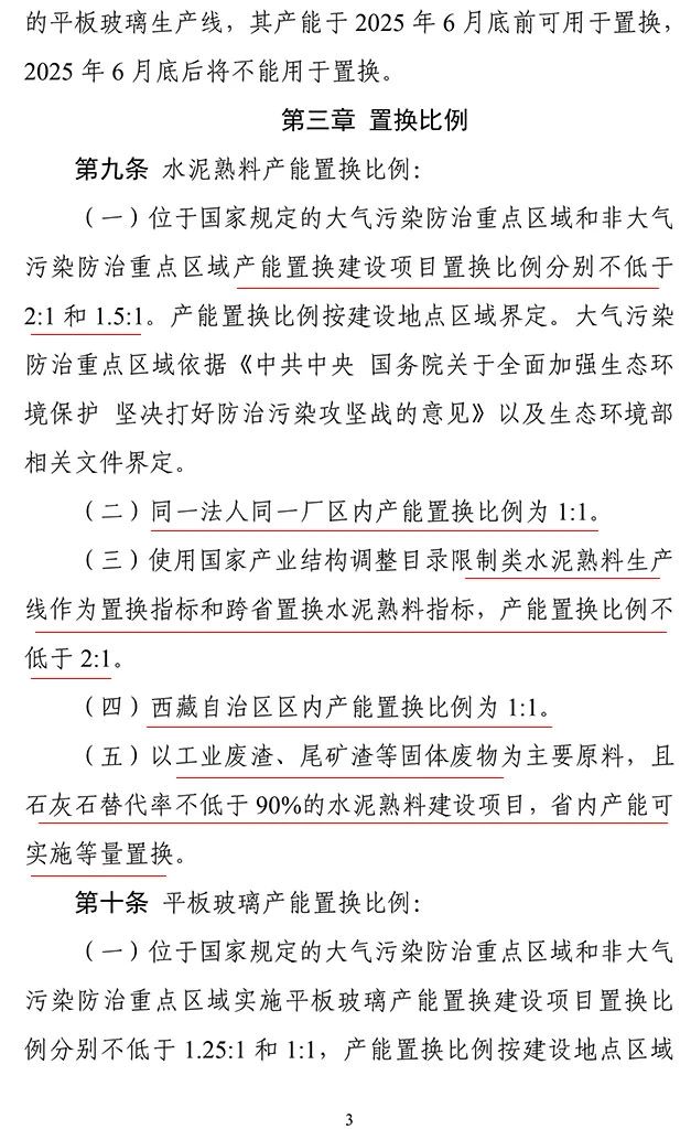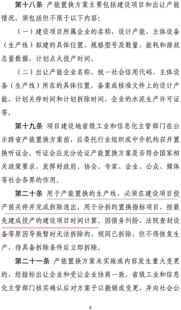 用于置換的水泥熟料生產(chǎn)線產(chǎn)能不能拆分轉(zhuǎn)讓。位于國家規(guī)定的大氣污染防治重點(diǎn)區(qū)域或水泥熟料產(chǎn)能利用率低于50%省區(qū)的新建水泥熟料生產(chǎn)線,原則上不得從省外置換產(chǎn)能。另外還提及水泥熟料產(chǎn)能置換比例要求。