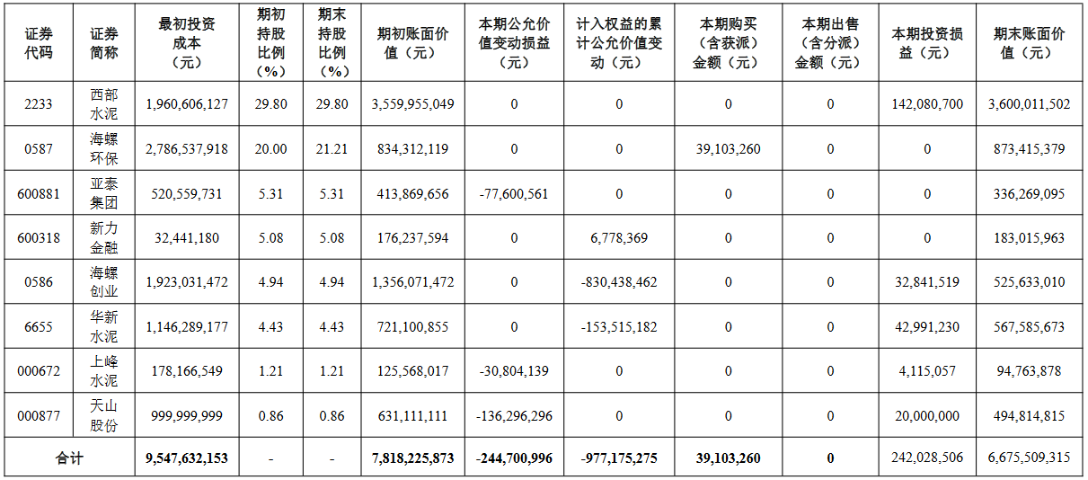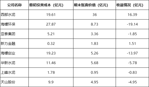 從投資的企業(yè)來看,僅西部水泥和新力金融屬于正收益,總收益17.9億元,而投資的海螺環(huán)保、亞泰集團(tuán)、海螺創(chuàng)業(yè)、華新水泥、上峰水泥、天山股份累計虧損46.52億元。