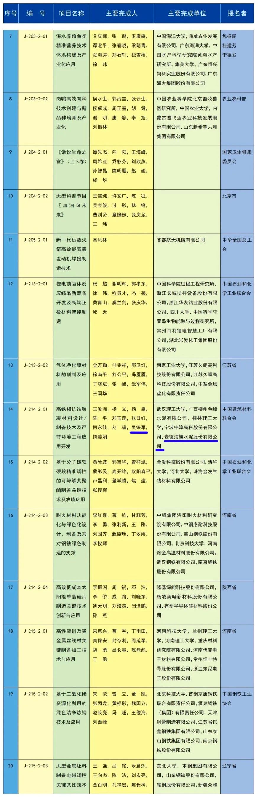 2023年度國家科技進步獎項目評選中,由中國建筑材料聯(lián)合會提名的《高鐵相抗蝕膠凝材料設計/制備技術及嚴苛環(huán)境工程應用開發(fā)》獲得二等獎,該項目完成單位分別有武漢理工大學、廣西柳州魚峰水泥有限公司、桂林理工大學、寧波中淳高科股份有限公司,以及安徽海螺水泥股份有限公司,其中,在主要完成人名單中,安徽海螺水泥股份有限公司副總經理吳鐵軍位列其中。