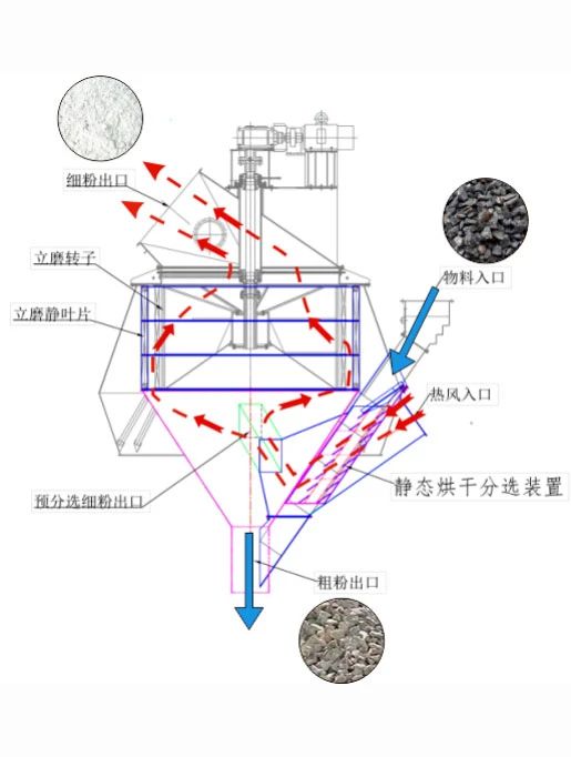 傳統(tǒng)立磨系統(tǒng)中,被粉磨物料都是通過中心喂料或邊沿喂料的方式,物料直接送到旋轉(zhuǎn)的磨盤上。物料在離心力作用下向磨盤邊緣移動的過程中,經(jīng)磨輥碾壓粉磨后,被甩到磨盤周圍的噴嘴環(huán)上,噴嘴環(huán)內(nèi)高速噴出的熱風將物料烘干、打散和分選,粗顆粒物料落回磨盤被再次粉磨,細粉隨風進入立磨選粉機二次分選,合格細粉進入轉(zhuǎn)子,作為成品收集入庫,不合格細粉落回磨盤,進入下一個粉磨、烘干、打散、分選的循環(huán)。