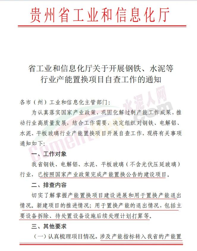 貴州省工信廳同期發(fā)布《關于開展鋼鐵、水泥等行業(yè)產(chǎn)能置換項目自查工作的通知》稱,為認真落實國家產(chǎn)業(yè)政策,鞏固化解過剩產(chǎn)能工作成果,推動行業(yè)高質量發(fā)展,結合工作需要,決定組織對鋼鐵、電解鋁、水泥、平板玻璃行業(yè)產(chǎn)能置換項目開展自查工作。