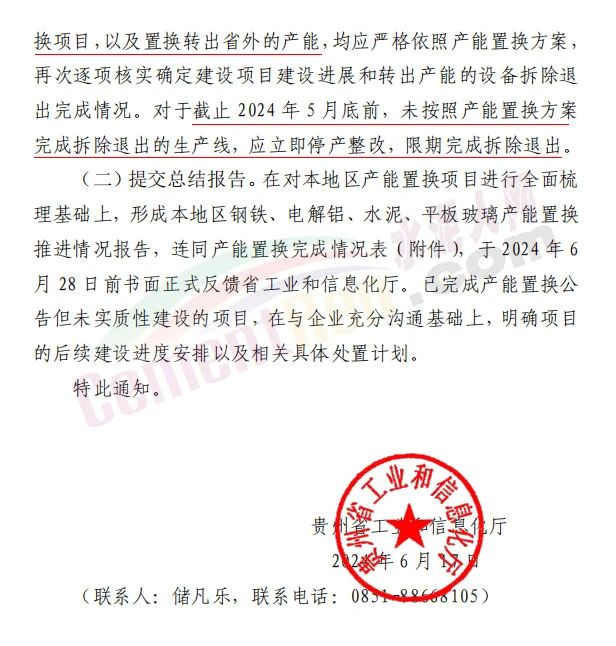 要求涉及產(chǎn)能指標轉入貴州省的產(chǎn)能置換項目,以及置換轉出省外的產(chǎn)能,均應嚴格依照產(chǎn)能置換方案,再次逐項核實確定建設項目建設進展和轉出產(chǎn)能的設備拆除退出完成情況。對于截止2024年5月底前,未按照產(chǎn)能置換方案完成拆除退出的生產(chǎn)線,應立即停產(chǎn)整改,限期完成拆除退出。