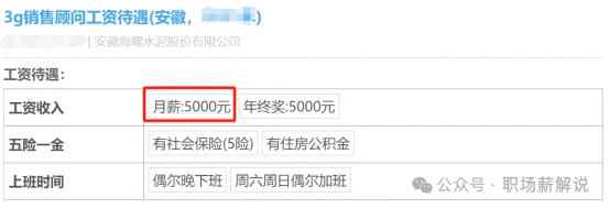 員工2:該爆料者是海螺水泥的一名3g銷售顧問,他現(xiàn)在的工資是5000元/月,年終獎金也是發(fā)一個月的工資,也就是5000元,同時也是購買了社保和住房公積金。他這個崗位加班比較多,工作日偶爾晚下班,周末的話也是偶爾需要加班。