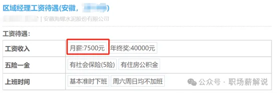 員工3:該爆料者是海螺水泥的一名區(qū)域經理,他現(xiàn)在每個月的工資是7500元,年終獎金是40000元,也有五險和住房公積金。他這個屬于管理層了,加班也不多,還算是不錯的。