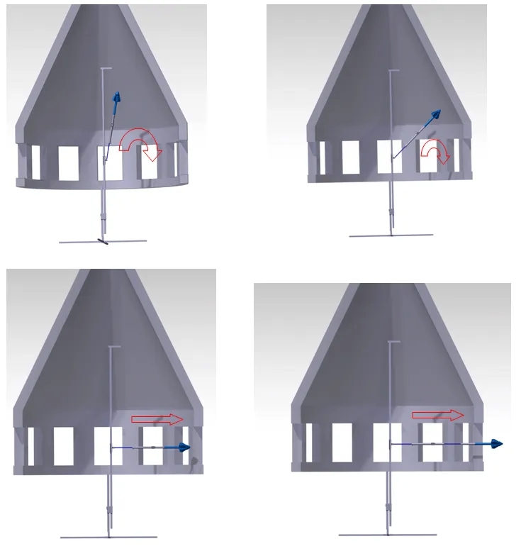 系統(tǒng)組成:結(jié)構(gòu)部分由錐內(nèi)的支架機構(gòu)、液壓回轉(zhuǎn)機構(gòu)、液壓推進機構(gòu)、變攻角機構(gòu)、氣力式擴張通堵頭和庫外液壓站組成;控制系統(tǒng)由庫頂三維激光料位儀、錐內(nèi)視頻監(jiān)控系統(tǒng)和庫外控制總成構(gòu)成。
