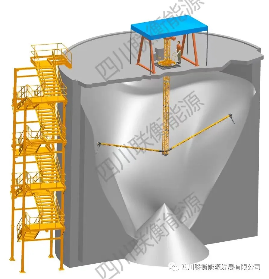 原理:設(shè)備從庫頂布設(shè),先根據(jù)現(xiàn)場情況,位于庫中心附近,開1米見方設(shè)備置入孔。再安裝旋轉(zhuǎn)支架平臺,組裝清壁機。清壁機置入庫內(nèi)后,在控制系統(tǒng)的操作下,將機械臂移動到需要清理的庫壁工作面,機械臂攜帶特種刀頭,在氣力作用下對掛壁料進行清理。錐形刀頭對掛壁硬料進行破碎,減小掛壁料厚度,鏟型刀頭對最后一層的掛壁料鏟除干凈。