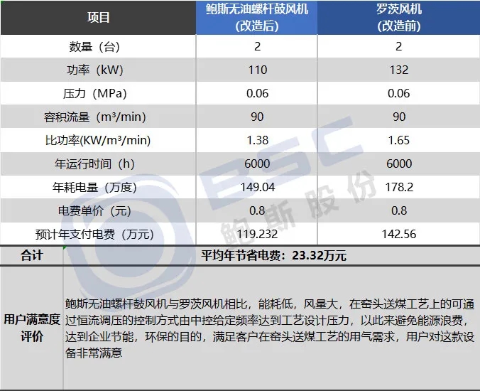 鮑斯股份在考慮到企業(yè)工藝需求穩(wěn)定性的同時有針性地對窯頭送煤風(fēng)機(jī)的特性提供了專項定制產(chǎn)品,完美貼合,贏得企業(yè)的好評。從企業(yè)反饋意見中可見,改造前使用羅茨風(fēng)機(jī)年耗電量達(dá)到178.2萬度,改為鮑斯無油螺桿鼓風(fēng)機(jī)后,年耗電量僅為149.04萬度,節(jié)電近30萬度,按照0.8元/度電計算,平均年節(jié)省電費(fèi)23.32萬元。