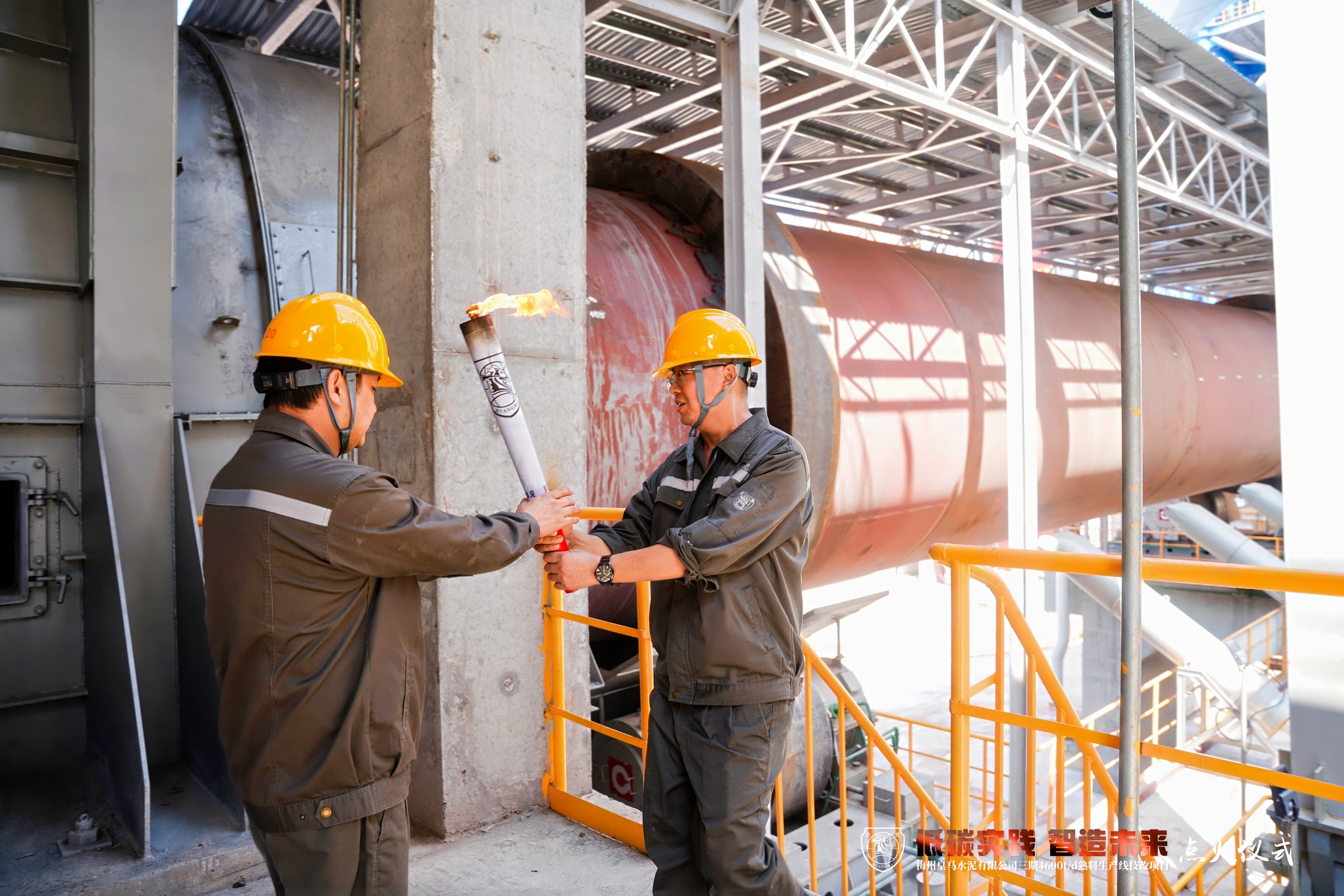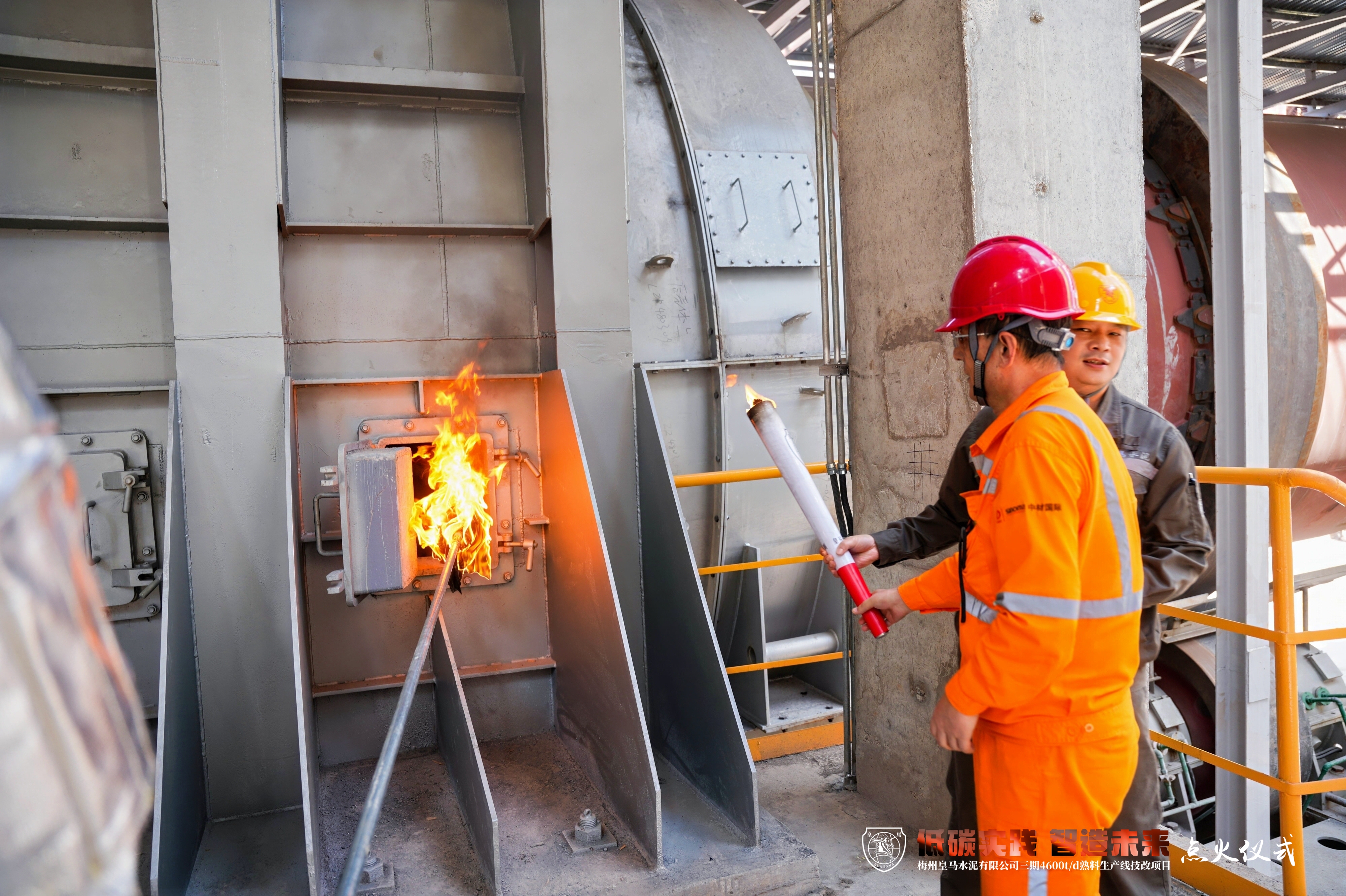 劉鴻濤為皇馬水泥三期技改項目宣布點火令,并與劉裕君、李信泰、曾子威、李黎、牛延林、王軍、馬修賓、馬修勇共同推桿,點燃火盆。隨后,馬修賓手持火炬從火盆中取得火種,點燃窯頭燃燒器并交接于公司代表,正式宣告該項目點火投產。