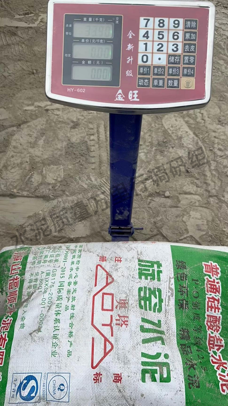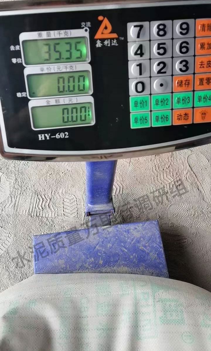 標(biāo)稱生產(chǎn)企業(yè)為唐山冀龍水泥的“喬潤”牌PSA32.5(50kg)產(chǎn)品,實(shí)際稱重為35.35kg。