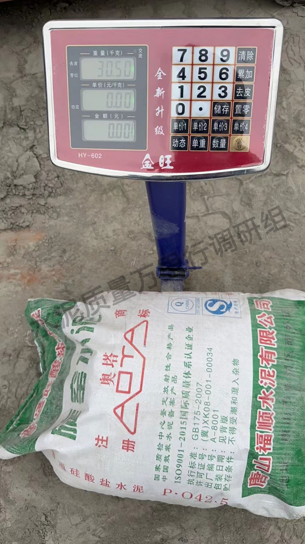 標(biāo)稱生產(chǎn)企業(yè)為玉田縣春城水泥廠的“福合”牌PO42.5(50kg)水泥,實(shí)際稱重為30.6kg。