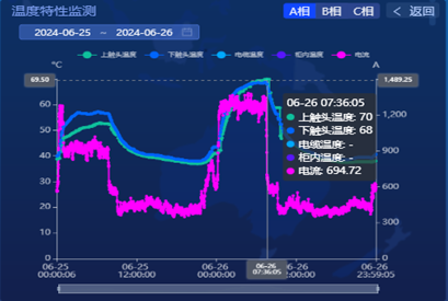 經(jīng)綜合評估后,立即降低用電負荷,臨時遏制溫度上升并組織檢查。之后持續(xù)查看系統(tǒng)平臺溫度變化曲線、溫度和電氣歷史數(shù)值、變化趨勢、接觸電阻值數(shù)據(jù),與柜內(nèi)靜觸頭溫度、電流變化曲線、負荷曲線對比,經(jīng)過連續(xù)幾天特護和觀察,確定柜內(nèi)靜觸頭溫度較斷路器觸頭溫度高。
