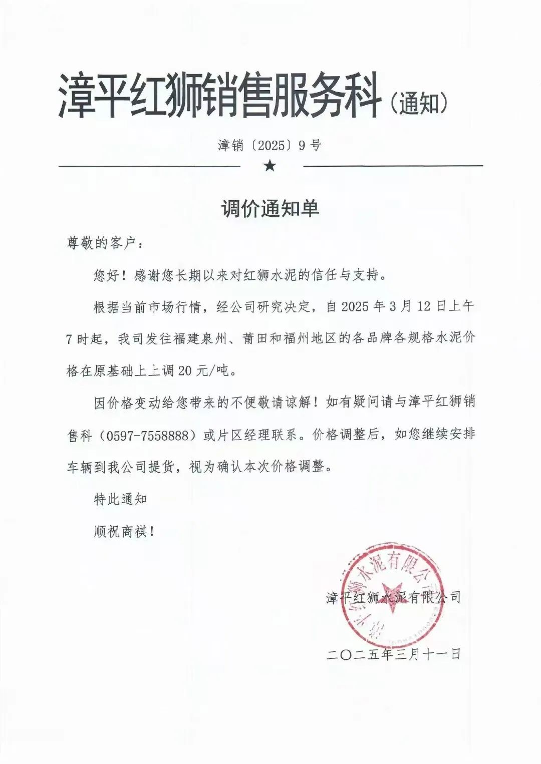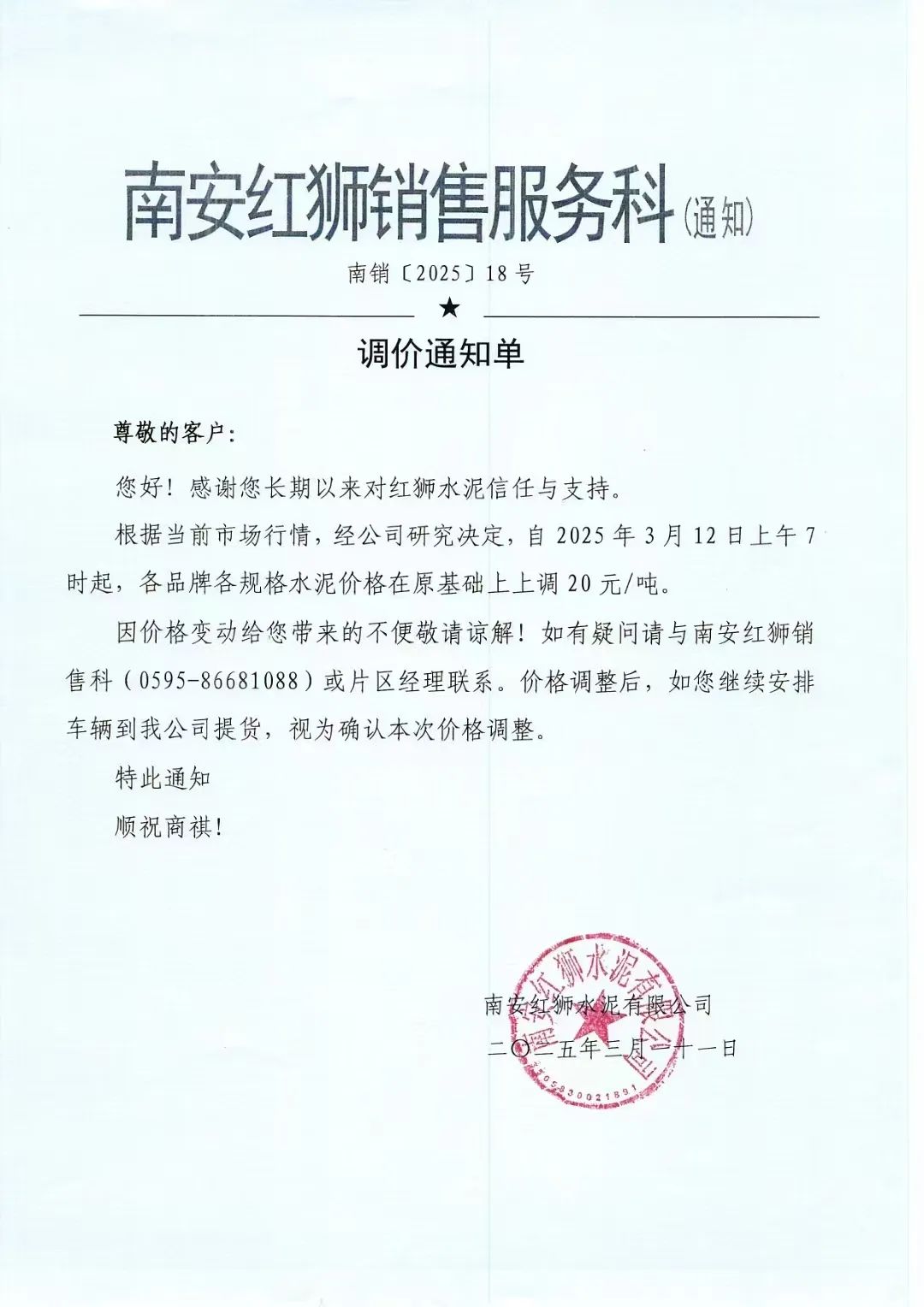 南安紅獅水泥通知,根據(jù)當(dāng)前市場(chǎng)行情,經(jīng)公司研究決定,自2025年3月12日上午7時(shí)起,各品牌各規(guī)格水泥價(jià)格在原基礎(chǔ)上上調(diào)20元/噸。