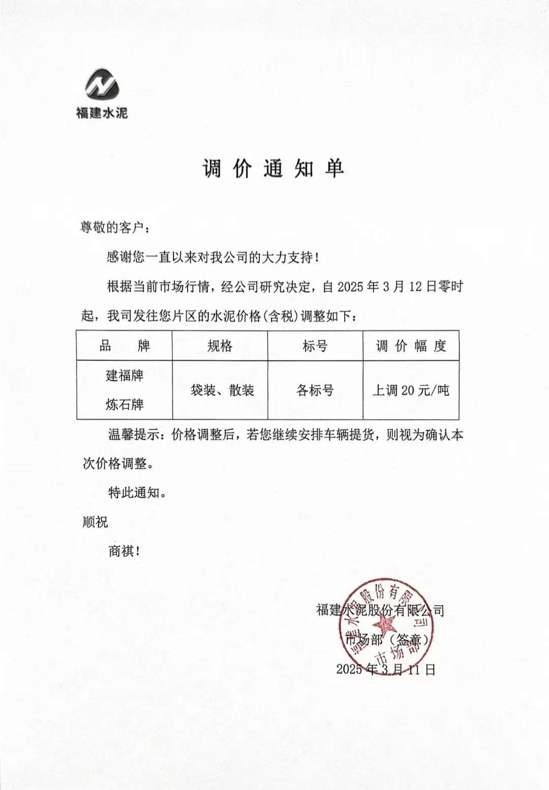 福建水泥通知,根據(jù)當(dāng)前市場(chǎng)行情,經(jīng)公司研究決定,自2025年3月12日零時(shí)發(fā)往各片區(qū)的建福牌、煉石牌水泥價(jià)格上調(diào)20元/噸。