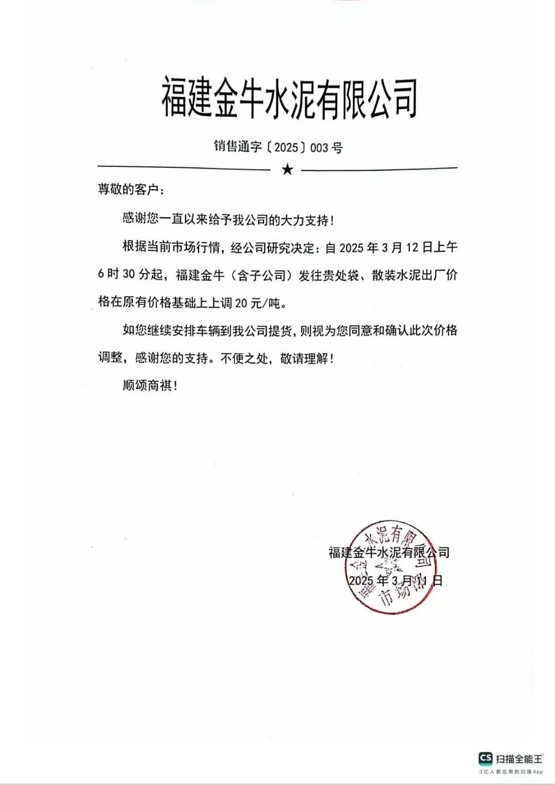 福建金牛水泥有限公司通知稱,根據(jù)當(dāng)前市場(chǎng)行情,經(jīng)公司研究決定自2025年3月12日上午6時(shí)30分起,福建金牛(含子公司)發(fā)往貴處袋、散裝水泥出廠價(jià)格在原有價(jià)格基礎(chǔ)上上調(diào)20元/噸。
