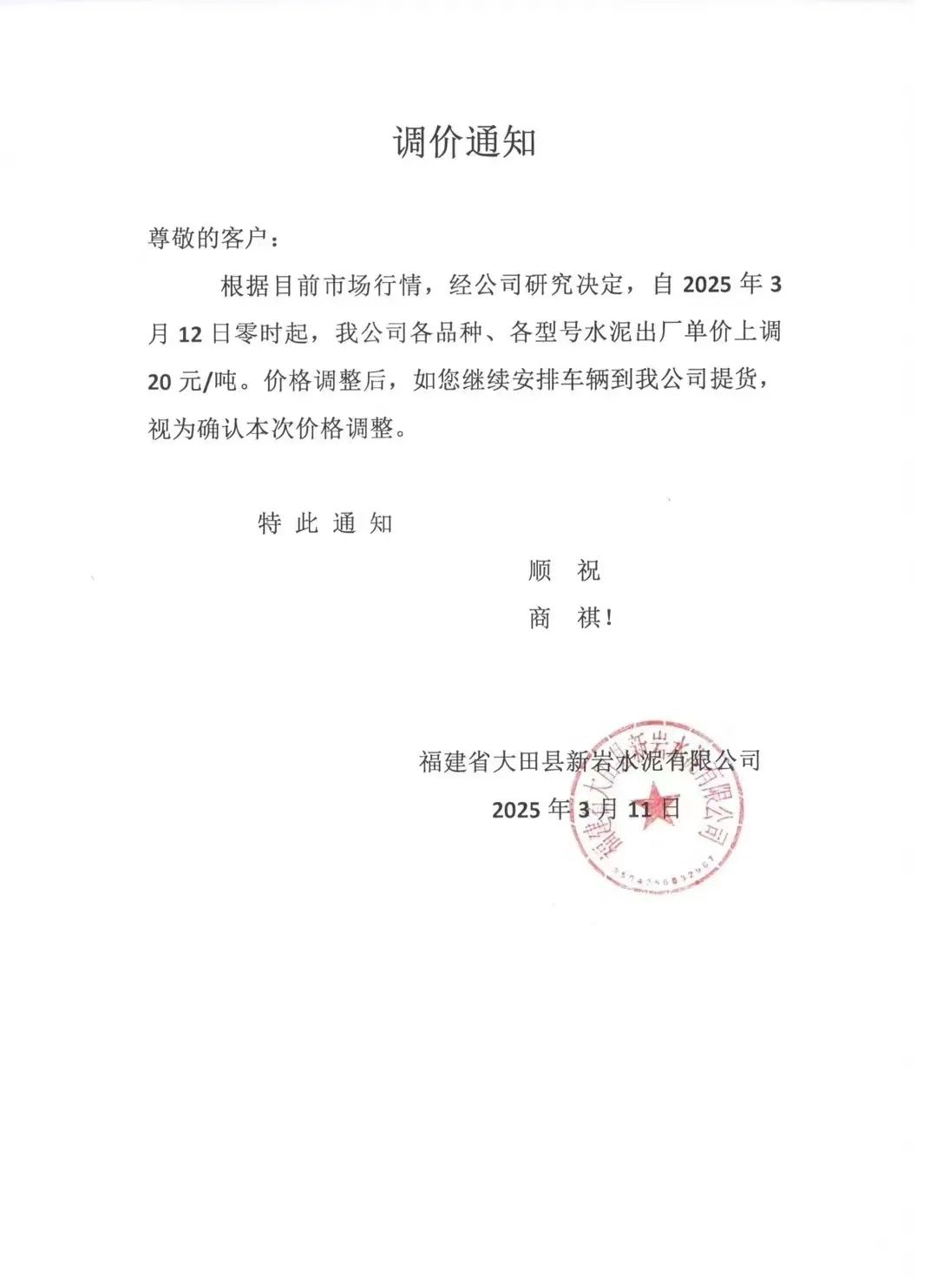 福建省大田縣新巖水泥有限公司通知稱,根據(jù)目前市場(chǎng)行情,經(jīng)公司研究決定,自2025年3月12日零時(shí)起,各品種、各型號(hào)水泥出廠單價(jià)上調(diào)20元/噸。大田鑫城水泥通知,3月12日上午8時(shí)起,“廣平巖城”、“大田鑫巖”、“鑫城金石鳳”等各品牌、品種水泥在現(xiàn)行價(jià)基礎(chǔ)上上調(diào)20元/噸。